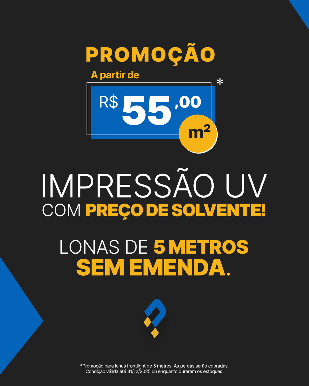 Nossas impressoras de última geração permitem impressão em grandes formatos: até 5 metros de largura em lona (tecnologia UV) e até 3,60 metros em materiais rígidos, além de 3,20 metros em eco-solvente. Assim, atendemos desde pequenos adesivos até grandes fachadas, sempre com qualidade impecável em qualquer escala.